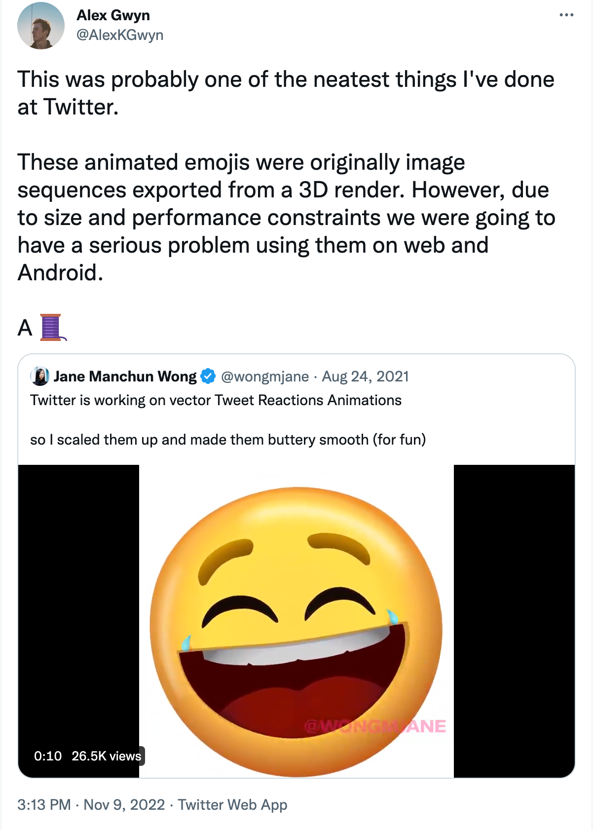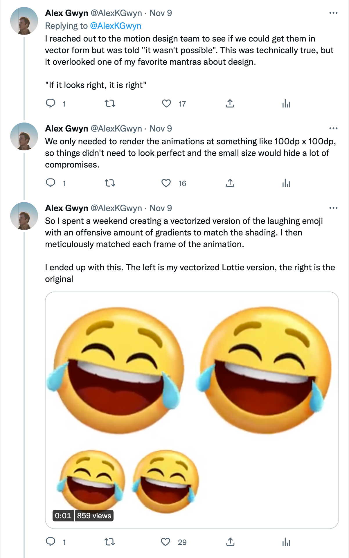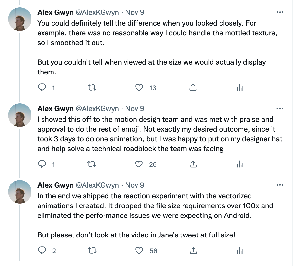 I reimplemented the animations provided by the design team as vector animations in order to solve performance and asset size concerns on Android and Web. This process involved recreating the emoji from scratch in a vector format, importing the vector into After Effects and manually motion matching the new vector animation to the existing frame based animation.